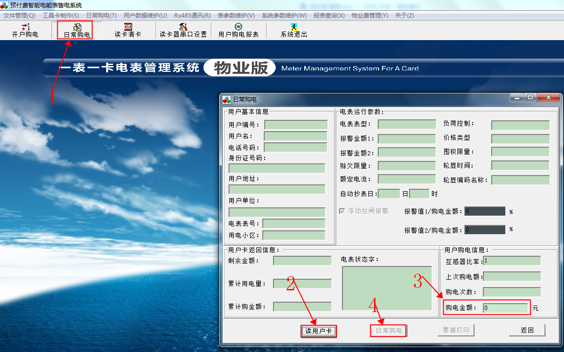 重新插張新卡到讀卡器,以上信息都根據(jù)自己要求設(shè)置好之后,單擊“開戶購電”。出現(xiàn)以下畫面。