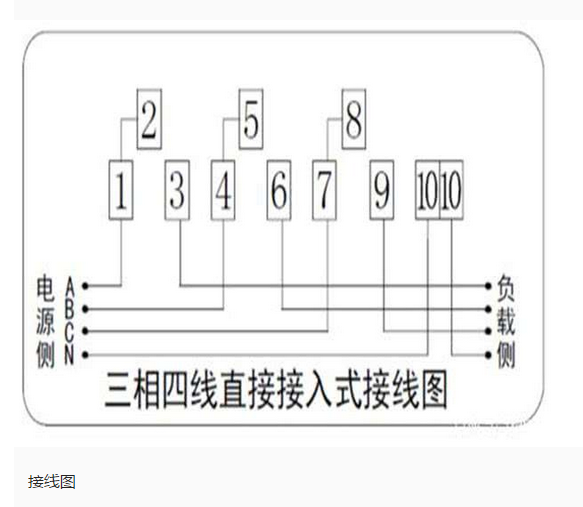 三相預付費電表直接式的接線比較簡單,編號從1到10,有的朋友只看到底部的7個接線柱,其實還有2、5、8三個接線柱,只不過這三個接線柱和147用連接片短接了,所以不需要再接線。這種直接式的三相四線電表的接線順序是:147接三相電源的進線,369接出線,最后的10接進出的零線。