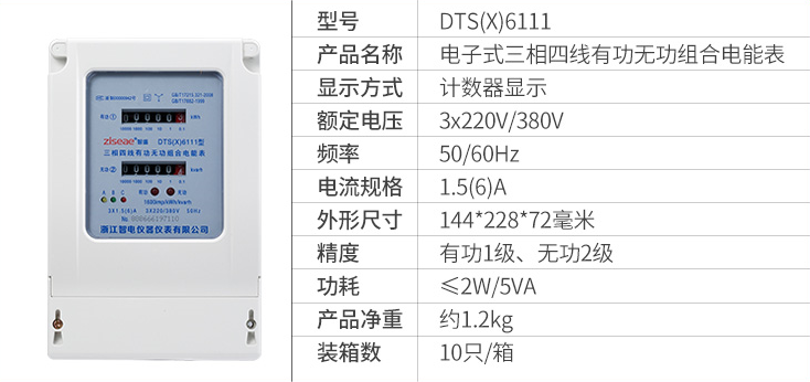 DTS(X)6111、DSS(X)6111型三相電子式有功無功組合電能表(以下簡稱電能表),是為了適應電網(wǎng)改造設計開發(fā)的有功、無功組合式電能表。它具有較高的準確度和可行性。本產品制造標準符合GB/T17215.321-2008《1級和2級靜止式交流有功電能表》、GB/T17215.323-2008、DL/T614-1997《多功能電能表》、DL/T645-1997《多功能電能表通信規(guī)約》等電力行業(yè)標準對三相靜止式電能表全部技術要求,是對需要進行無功電量考核的企業(yè)、變電站或電廠理想的選擇,亦適合輸配電或配網(wǎng)自動化用表。本產品可供計量參比頻率為50Hz電網(wǎng)中的三相交流有功和無功電能,并能進行正、反向電能計量和紅外及RS485通訊功能。其特點是精度高、可靠性好、寬負荷、低功耗、誤差曲線平直、抗干擾能力強。