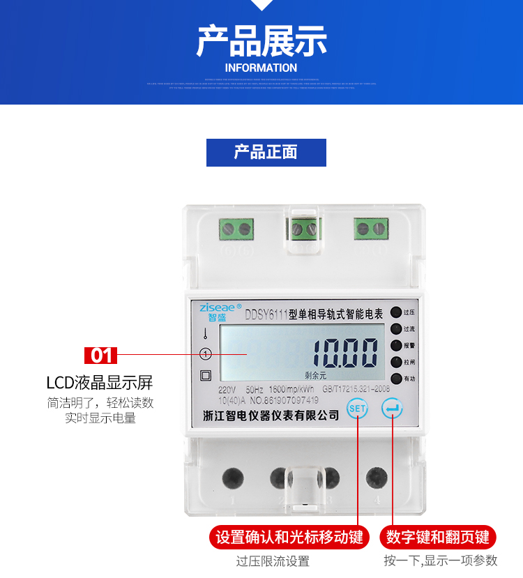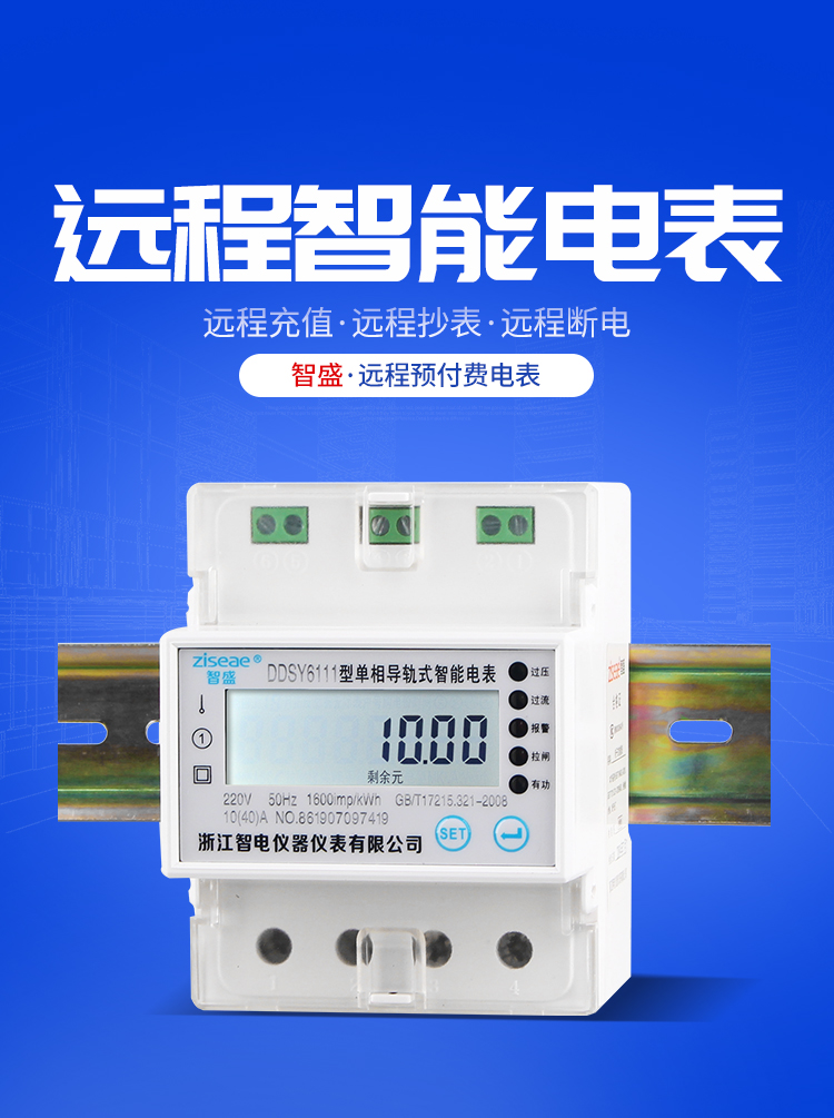 DDSY6111型遠程導軌式單相預付費電能表,采用單片微控制器進行數據采集,處理和保存。具有良好的抗電磁干擾,低功耗,高過載、準確度高,壽命長等優點。其性能指標符合GB/T 17215.321-2008《1級和2級靜止式交流有功電度表》中對電子式有功電度表的技術要求,符合GB/T15284-2002《多費率電能表 特殊要求》對復費率電能表的技術要求,并符合GB/T18460-2001《IC卡預付費售電系統》的各項技術要求。通信規約可支持DL/T 645-2007《多功能電能表通信規約》,為用電自動化管理提供了必備的條件。
