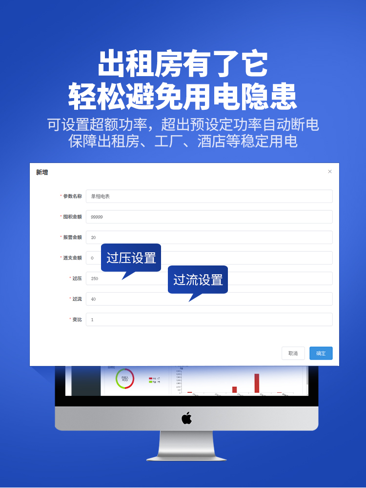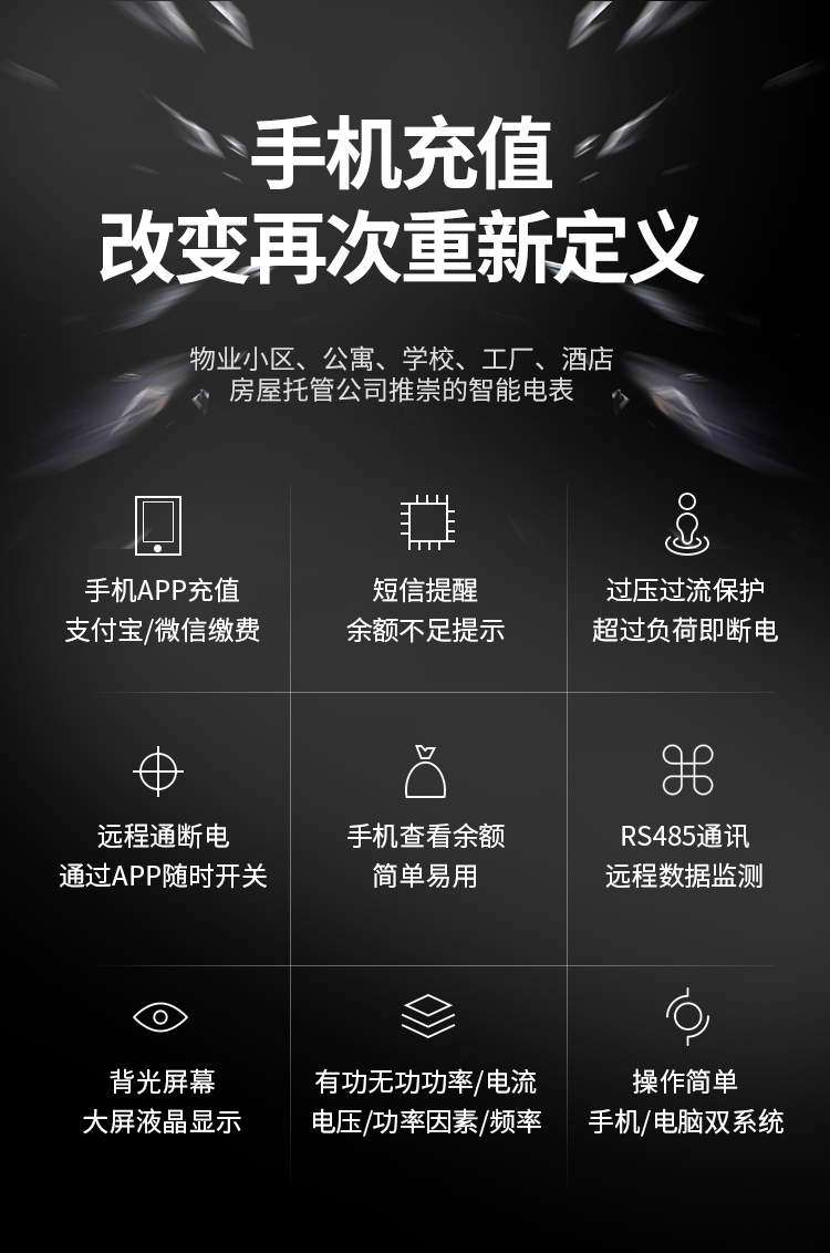 遠程充值預付費電表可與本公司遠程抄表系統和手機APP配套使用,遠程抄表管理系統具有實時抄表、定時抄表外,還提供了設備管理功能,如告警、余額短信通知、遠程充值、手機抄表、手機查詢、手機充值、預付費、后付費、自助充值機充值、遠程拉合閘、過壓過流保護、各種查詢報表、統計報表下載等功能。